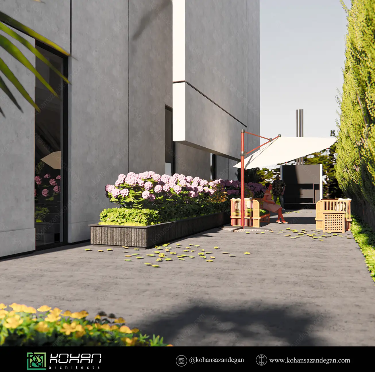 - فلاورباکسهای بتنی با پوشش متنوع گیاهی (خطوط سبز افقی)